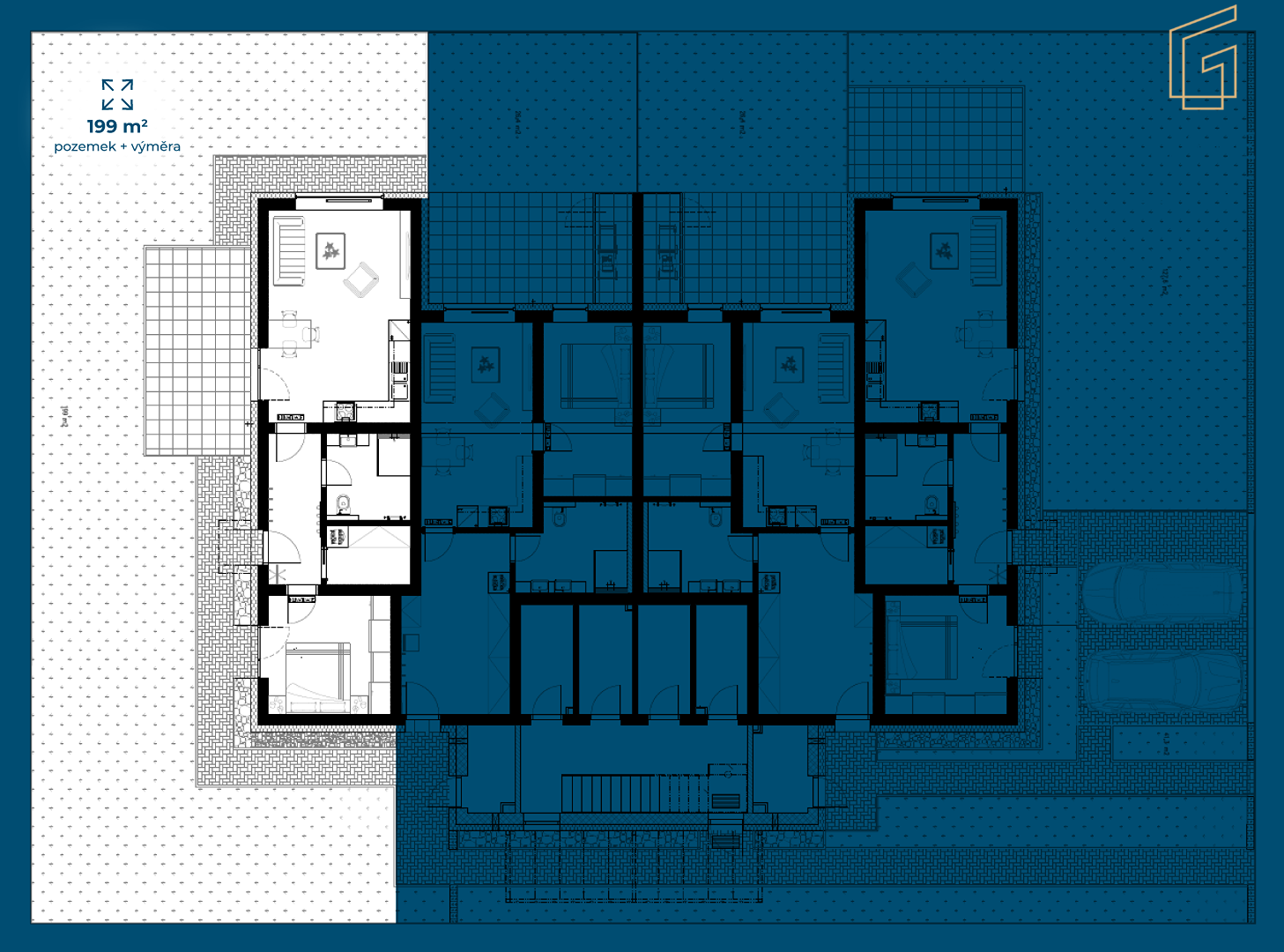 Parkovací stání i zahrada mají vlastní parcelní čísla a budou ve výlučném vlastnictví kupujících.