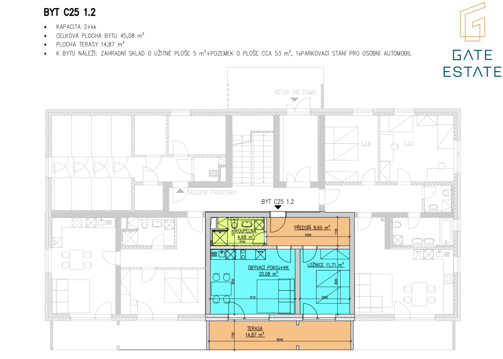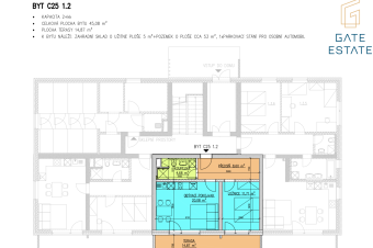 Zde inzerovaný byt 2kk má velikost 45m2, 53m2 zahrada, 15m2 terasa, 5m2 sklad + 1x parkovací stání.