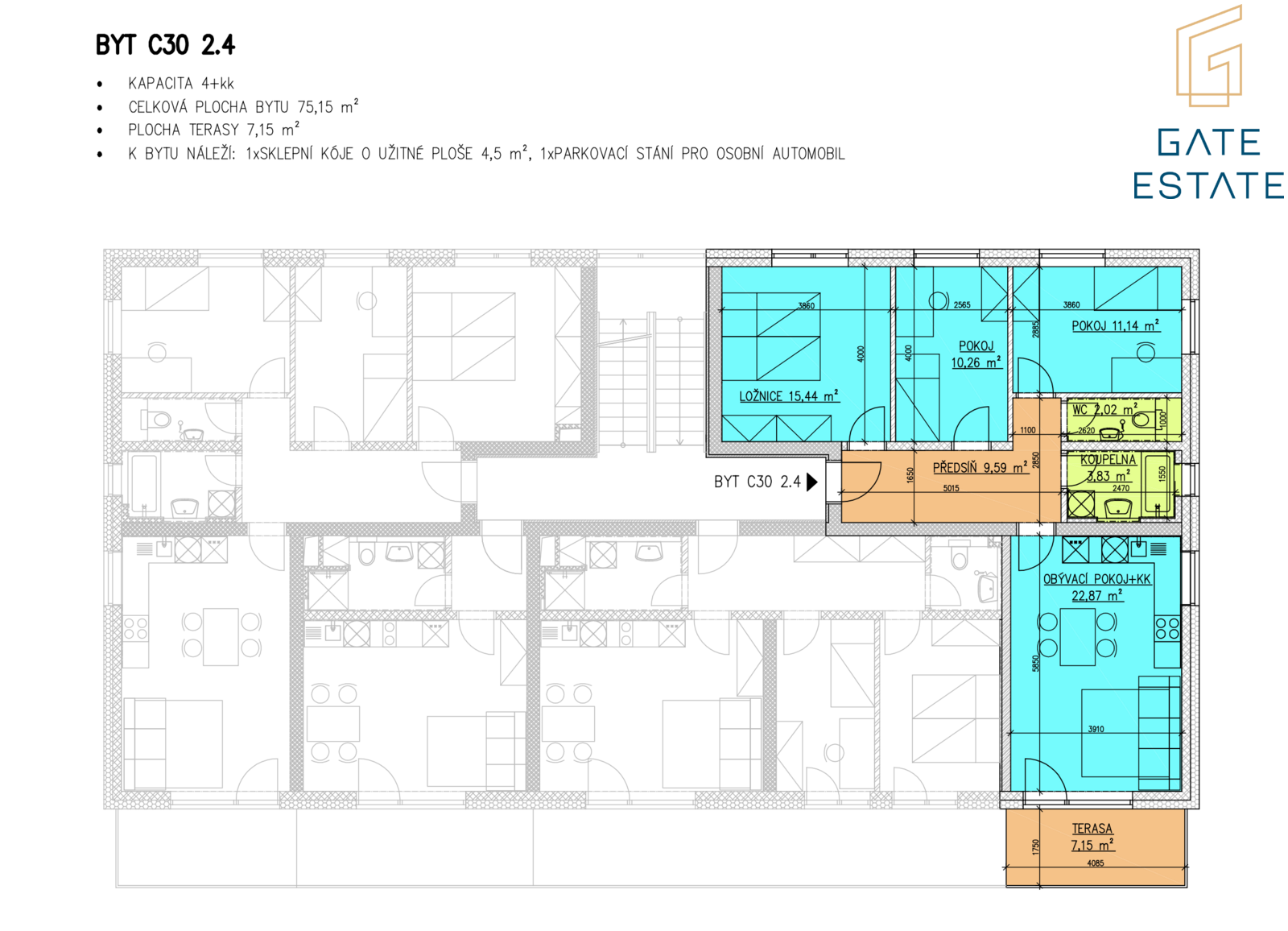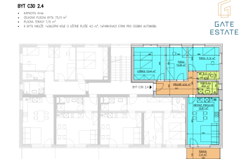 Zde inzerovaný byt č. C30 – 4kk má velikost 75m2 + 7m2 balkon + 5m2 sklad + 1x parkovací stání.