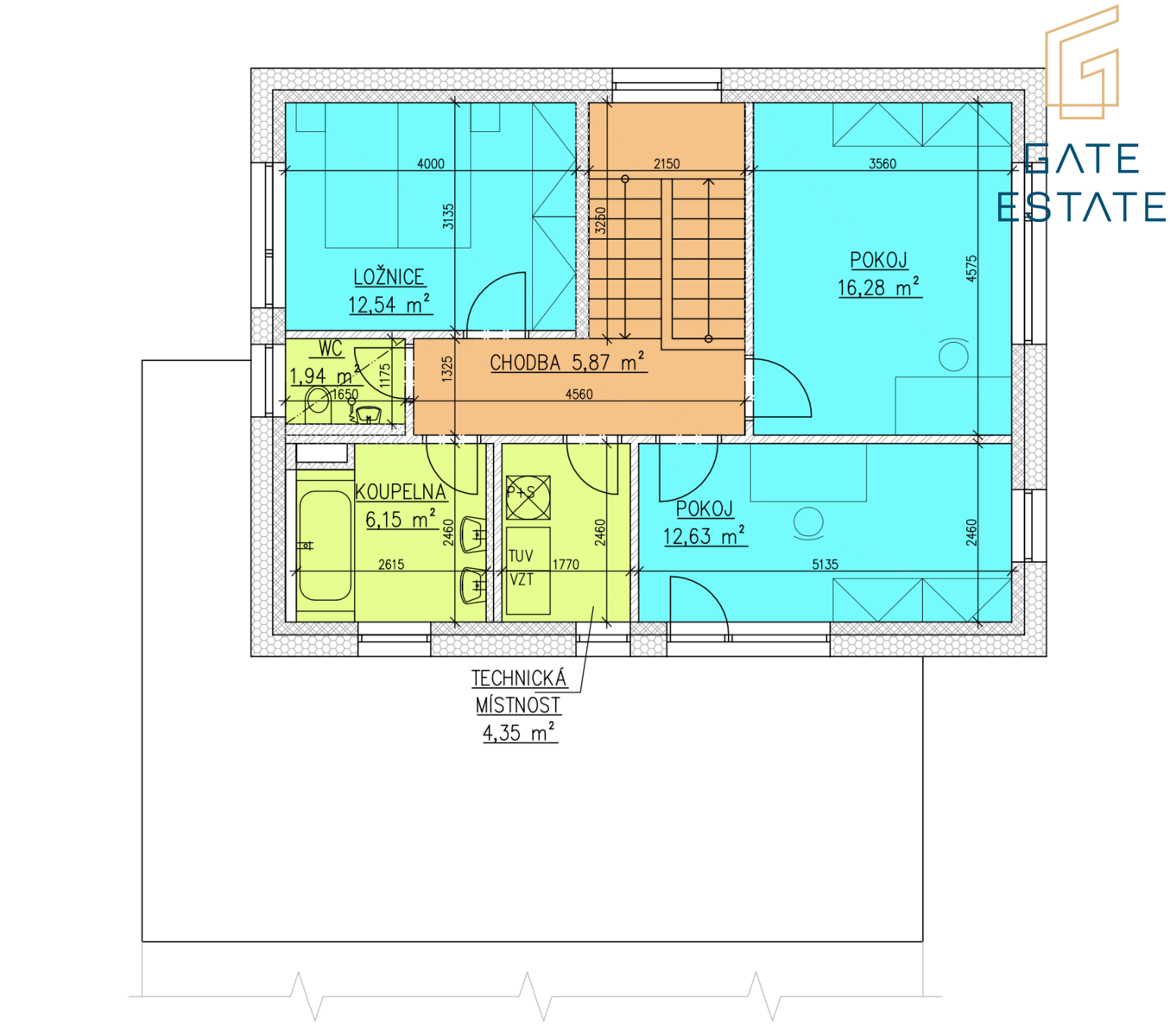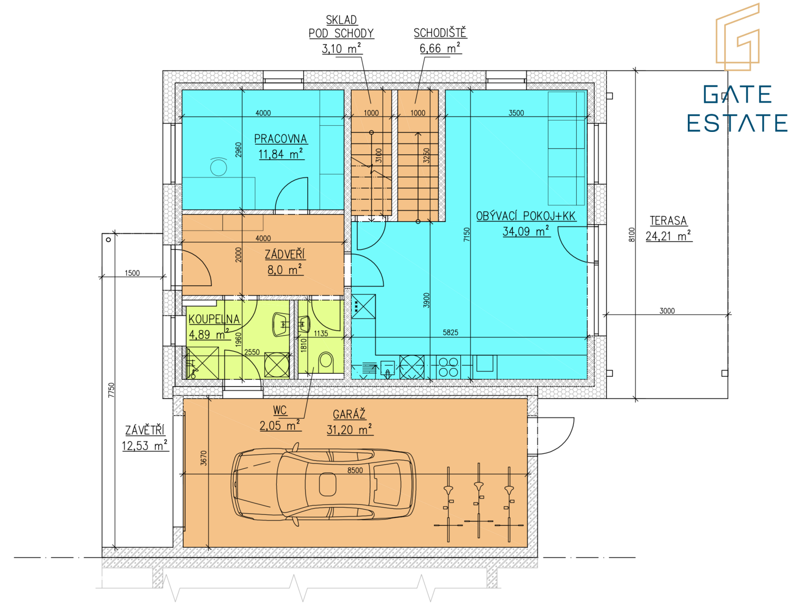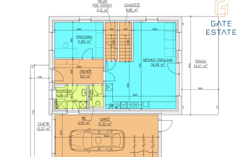 – Koupelna s průchodem do garáže, samostatná toaleta a zádveří.