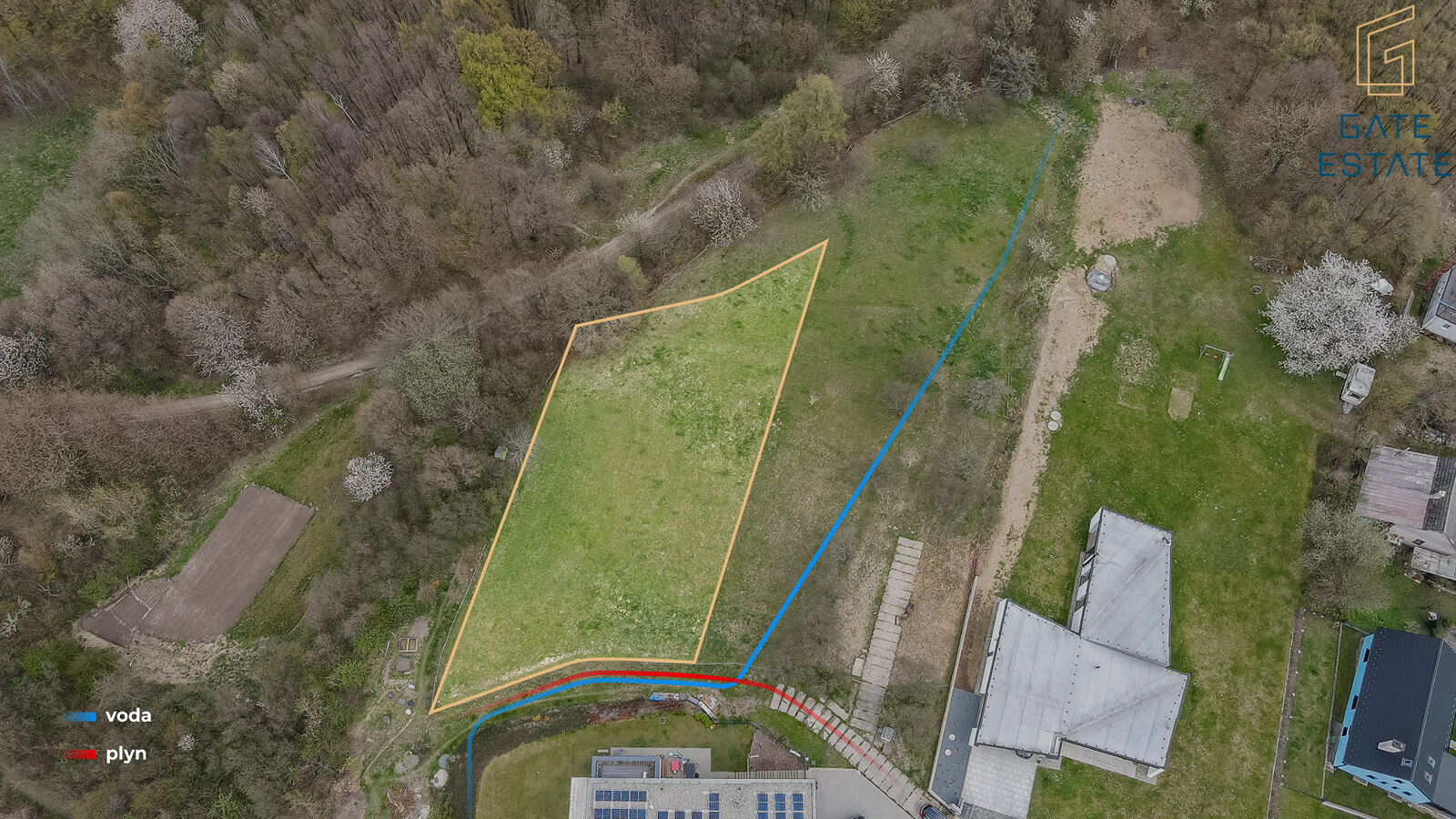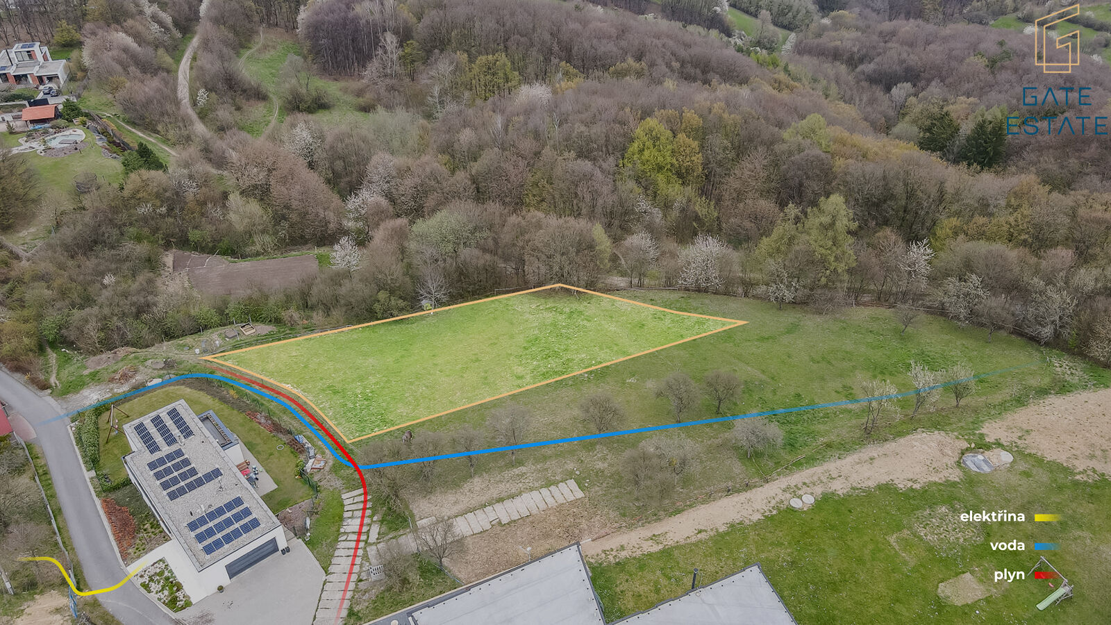 Inženýrské sítě: Voda a plyn jsou přímo u pozemku, elektřina je dostupná do 35 metrů a odpady lze řešit čističkou odpadních vod.