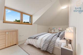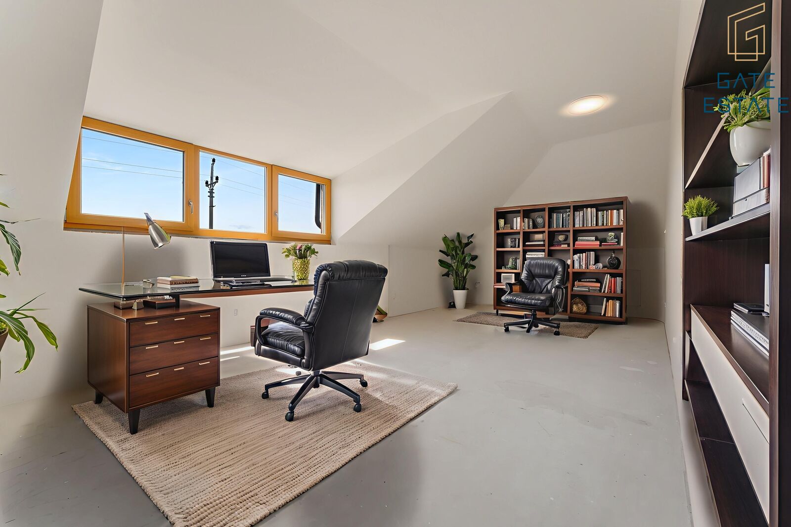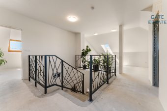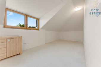 Do podkroví vás zavede elegantní betonové schodiště s ocelovým zábradlím. Najdete zde dva pokoje, koupelnu, samostatné WC a otevřený prostor s přípravou na kuchyň – ideální pro vybudování samostatné jednotky pro děti nebo rodiče. Celé podkroví je ve fázi před dokončením, takže nový majitel si ho může dotvořit přesně podle svých představ. Praktickým bonusem je úložný prostor o velikosti cca 35 m², chytře ukrytý ve zdech po celém patře.