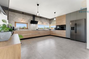 Po vstupu do domu projdete předsíní a chodbou, odkud se vám otevře srdce celého domu – obývací pokoj s kuchyní a jídelnou o velikosti téměř 65 m². Kuchyň je vyrobena na míru truhlářem, vybavena vestavěnými spotřebiči a americkou lednicí. Za kuchyňskou linkou je designová omyvatelná stěrka a kování Blum.